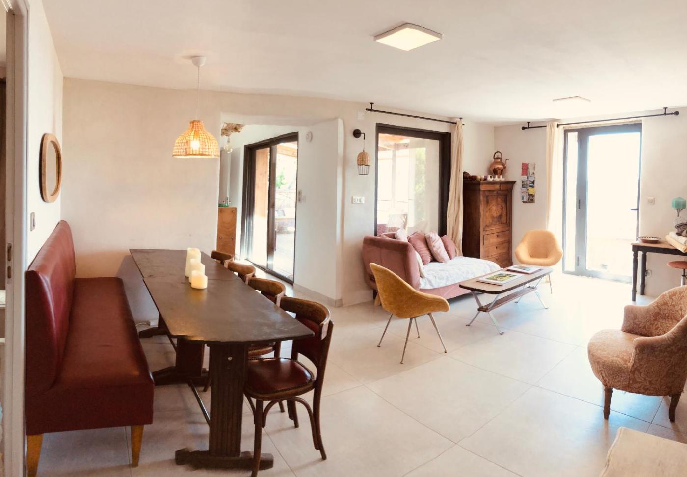 Maison 1 Chambre. The fireplace is a top feature of this holiday home. Boasting a private entrance, this air-conditioned holiday home comes with 1 living room, 1 separate bedroom and 1 bathroom with a walk-in shower and a bath or a shower. Guests will find a stovetop, a refrigerator, a dishwasher and kitchenware in the well-equipped kitchen. The holiday home also includes a barbecue. The holiday home has a tea and coffee maker, a seating area, a dining area as well as a terrace with garden views. The unit has 2 beds. ;