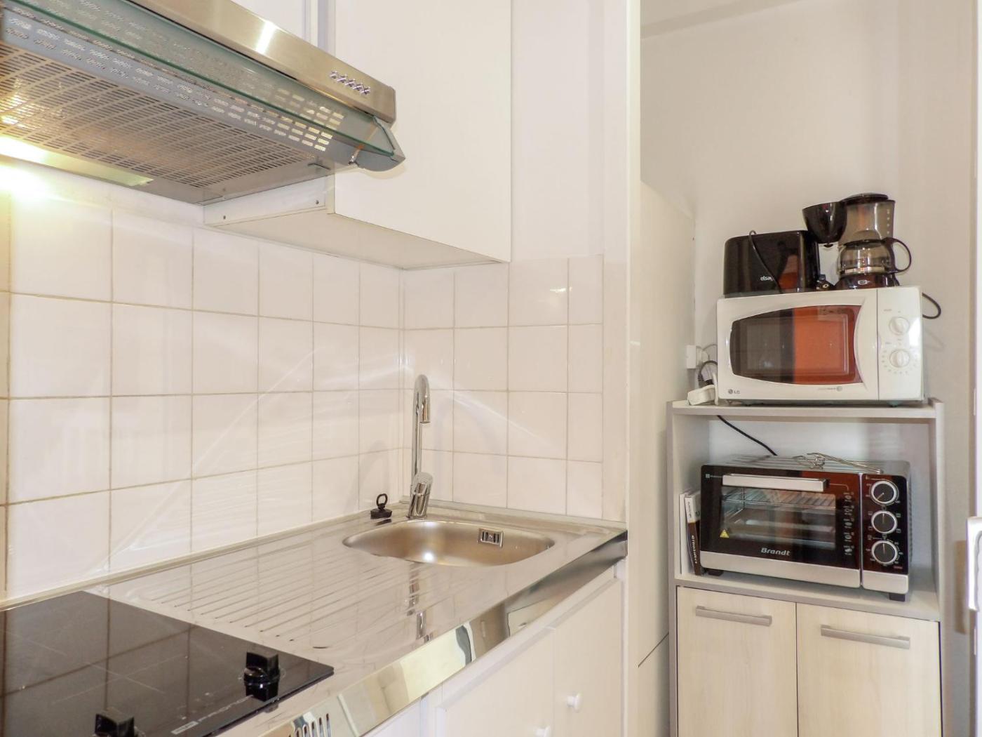 Studio. La kitchenette entièrement équipée est munie de plaques de cuisson, d’un micro-ondes, d’un réfrigérateur et d’ustensiles de cuisine. Ce studio dispose d’une salle de bains privative, d’une machine à café, d’un coin repas et d’un balcon. Ce logement comporte 3 lits.