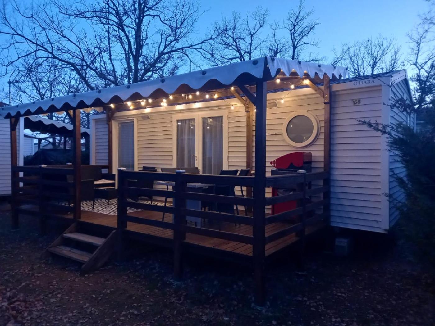 Mobile Home. The air-conditioned mobile home has 2 bedrooms and 1 bathroom with a walk-in shower and a hairdryer. Guests will find a stovetop, a refrigerator, kitchenware and an oven in the kitchen. The mobile home also features a barbecue. Boasting an outdoor dining area, this mobile home also offers a coffee machine, a seating area and a flat-screen TV. The unit has 3 beds.